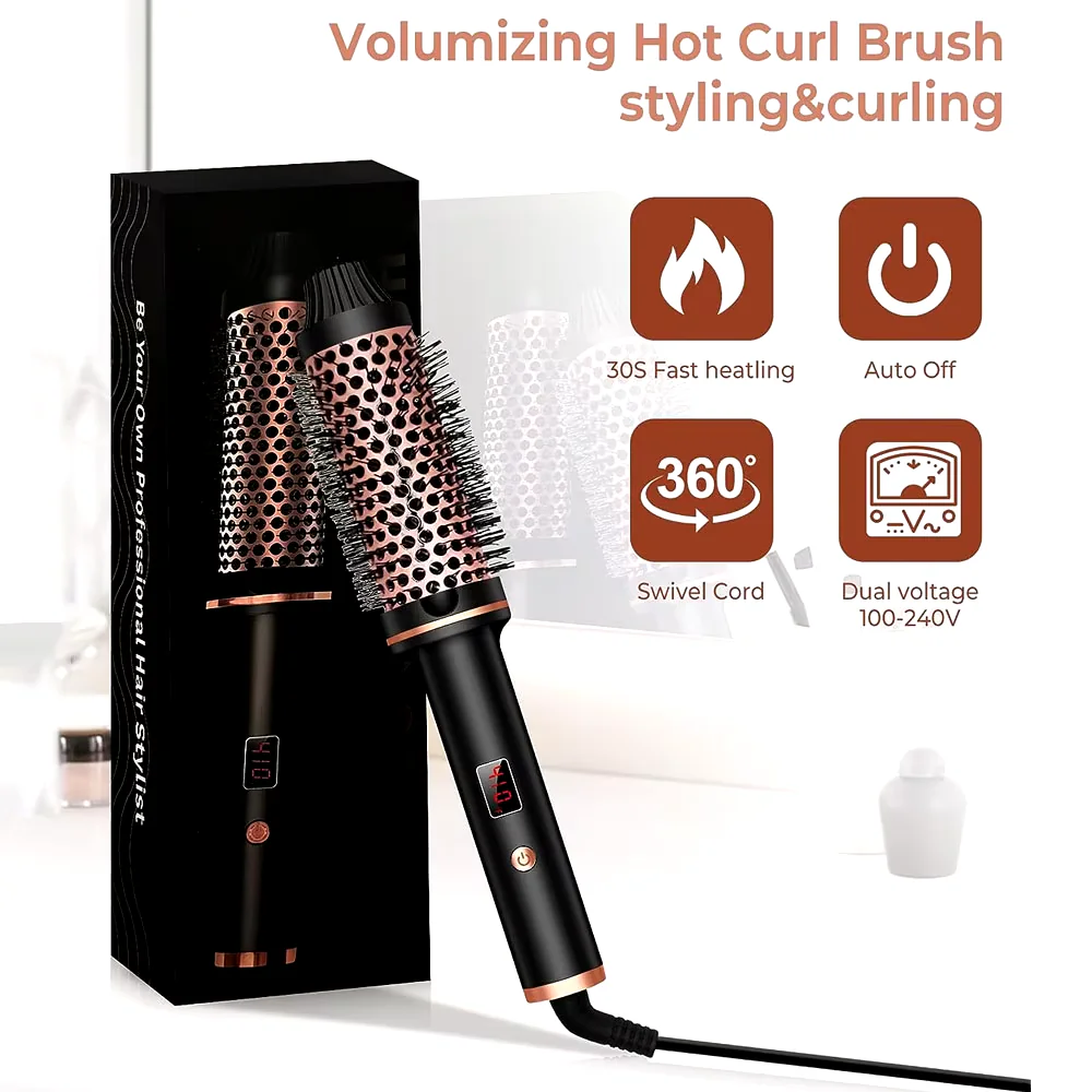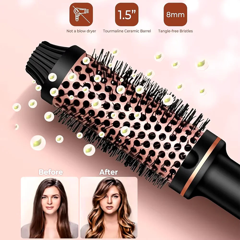 【Volumizing Brush Curling Iron】 1,5-calowa podgrzewana szczotka do objętości korzeni tworzy objętość korzeni i luźne loki dzięki profesjonalnej turmalinowej ceramicznej lufie szczotki termicznej, która eliminuje elektryzowanie się i oswaja puszenie się, pozostawiając włosy wyglądające zdrowo i lśniąco. Podwójne napięcie 3/4-calowa gorąca szczotka do loków ma tylko 170 g i 8,7 cala długości, jest idealna do podróży. UWAGA: TO NIE JEST SZCZOTKA Z GORĄCYM POWIETRZEM!!!